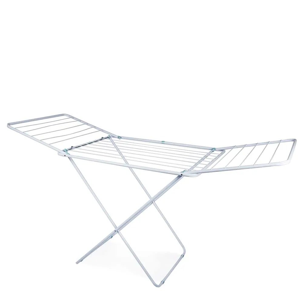 Varal de Chão com Abas Maxi otimiza seu espaço para pendurar roupas, além de ser fácil de guardar, já que pode ser dobrado e cabe em qualquer lugar. Produzido em tubo de aço com acabamento em pintura epóxi a pó e peças plásticas de polipropileno, inclusive as sapatas nos pés que protegem o piso de possíveis danos. Possui oito varetas no centro e duas abas com cinco varetas cada que comportam aproximadamente 16,2m de roupas ou 25Kg de roupas úmidas distribuídas uniformemente.